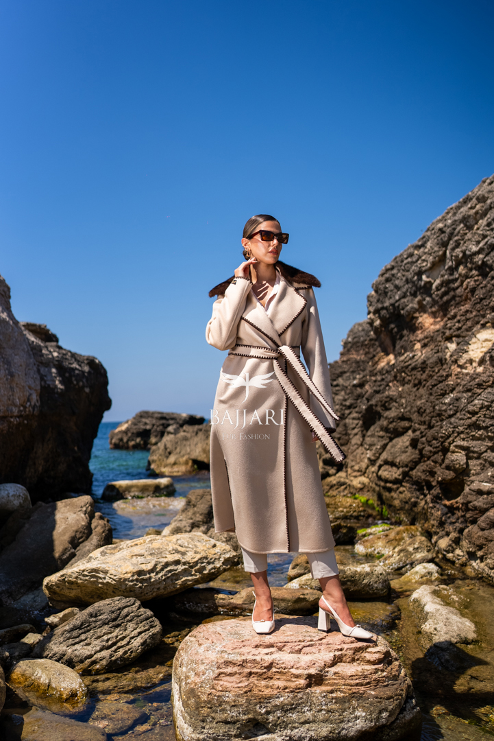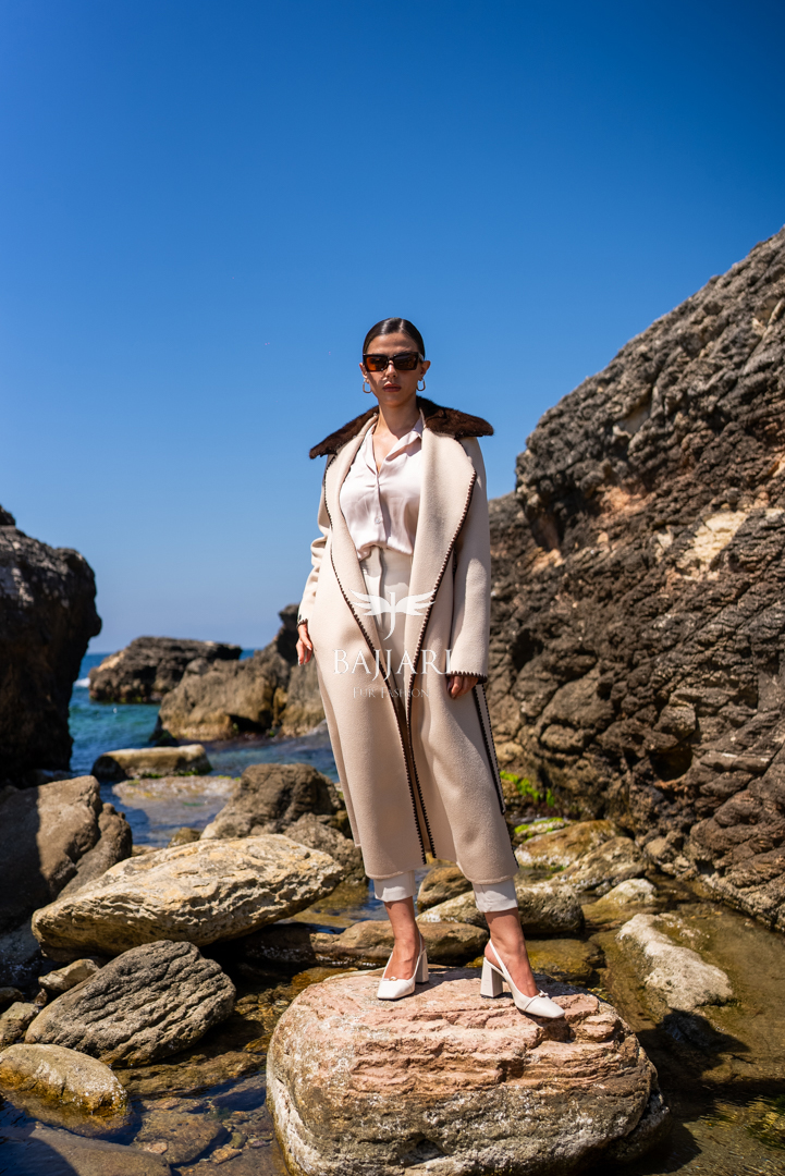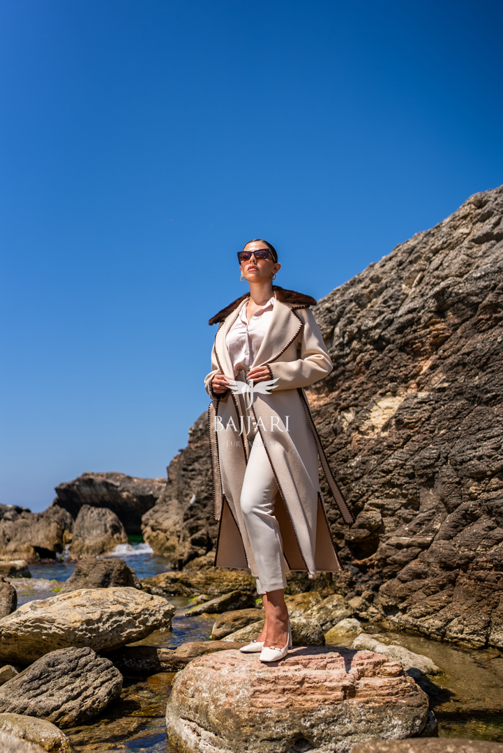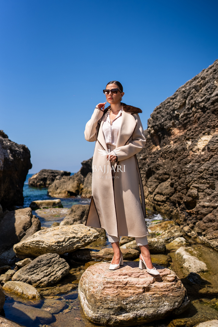 Crafted from high-quality alpaca wool, this model stands out with its intricate embroidery that adorns the fabric’s edges. The luxurious mink fur on the collar adds an elegant touch, while the included belt allows you to accentuate your waistline stylishly. Custom production is available for all sizes.