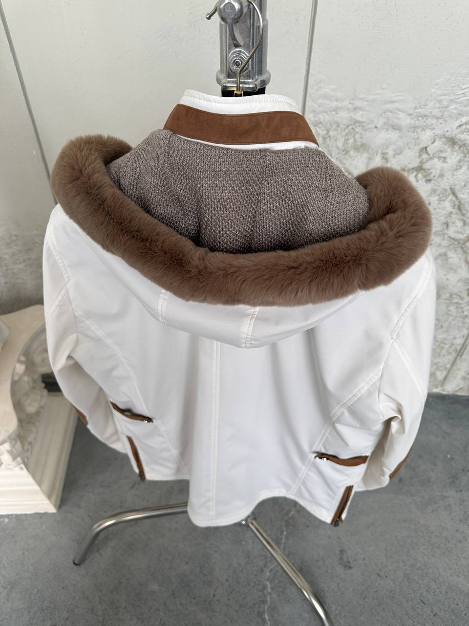This elegant jacket combines urban style with comfort. Featuring a waterproof fabric, a soft cashmere yarn inner lining, and sophisticated suede leather details, it stands out with its refined design. The real rabbit fur on the hood adds a luxurious touch, while the removable hood offers versatility. Lightweight and detailed, it is a unique piece to complete your style in any setting.